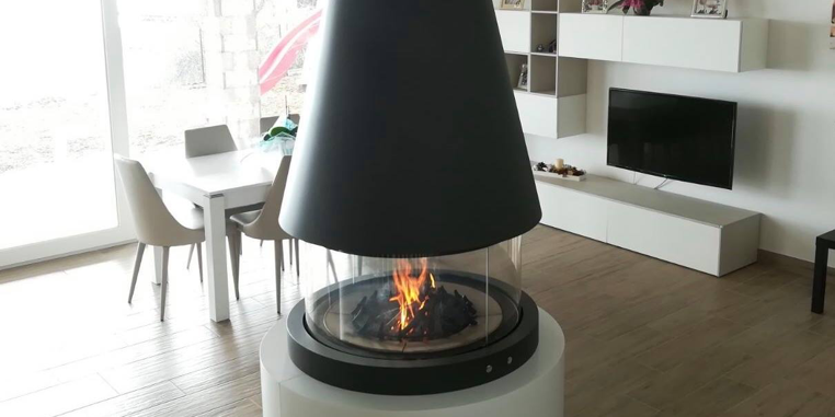 Monoblocco tondo in acciaio rivestimento in maiolica e vetro panoramico a 360°.